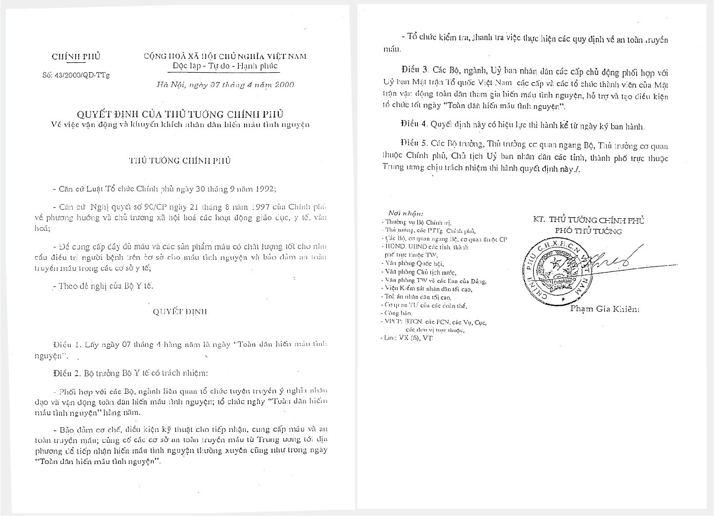 Quyết định số 43/QĐ-TTg ngày 7/4/2000 về việc Vận động, khuyến khích toàn dân hiến máu tình nguyện và lấy ngày 7/4 là “Ngày Toàn dân hiến máu tình nguyện”.