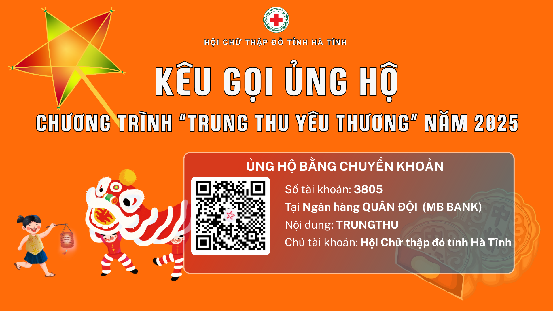 Với mong muốn mang đến cho các em một Trung thu ấm áp, sẻ chia yêu thương, động viên tinh thần và tiếp thêm niềm tin bước vào năm học mới, Hội Chữ thập đỏ tỉnh Hà Tĩnh triển khai Chương trình “Trung thu yêu thương” năm 2025 và kêu gọi sự chung tay ủng hộ của các cơ quan, đơn vị, doanh nghiệp, tổ chức, cá nhân hảo tâm.