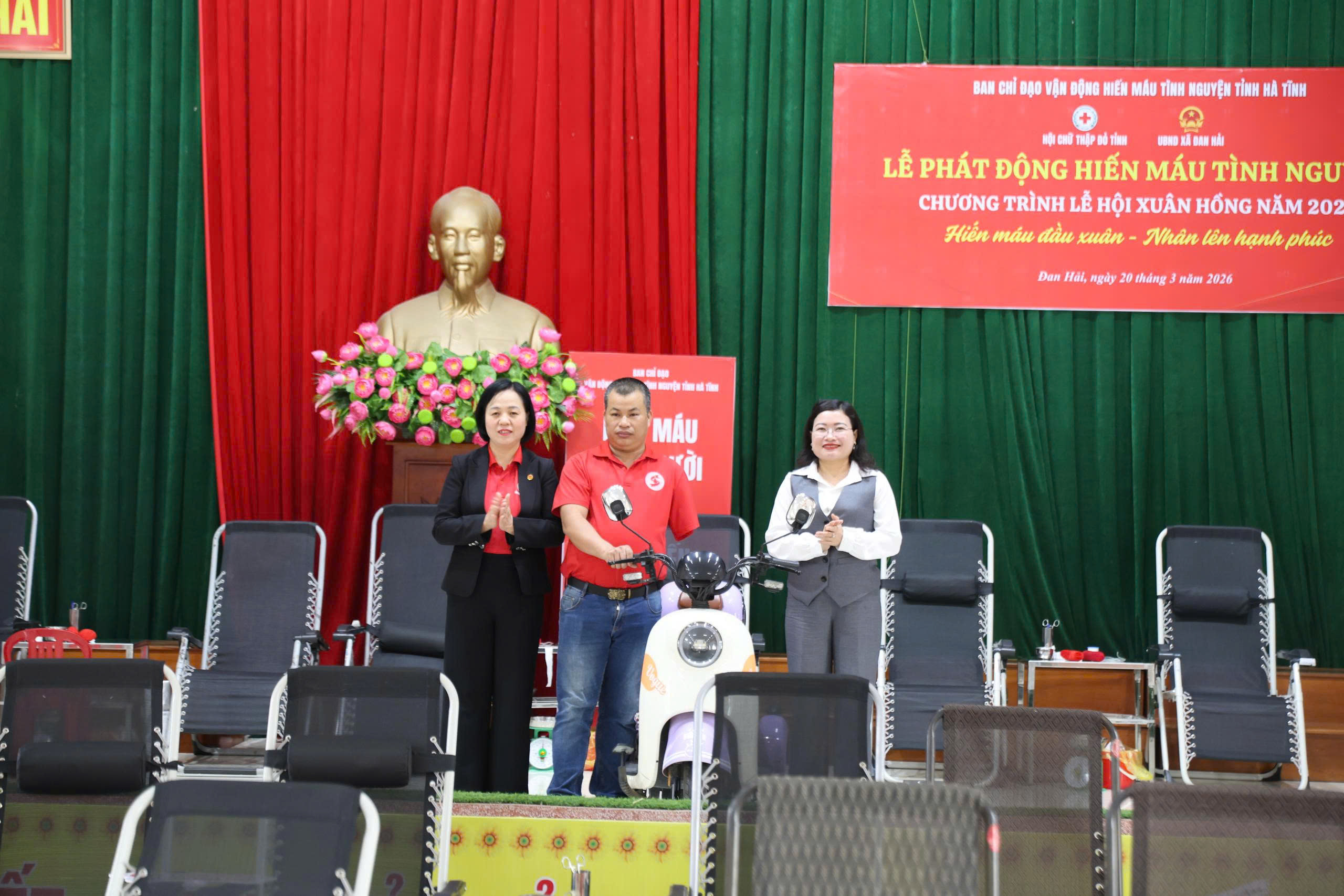 Phó Chủ tịch UBND tỉnh Nguyễn Thị Nguyệt và Chủ tịch Hội Chữ thập đỏ tỉnh Lê Thị Mai Hoa trao quà cho anh Cao Đức Trâm (xã Đức Quang) cá nhân tiêu biểu đã có trên 50 lần hiến máu và trực tiếp hiến máu cấp cứu cho bệnh nhân.