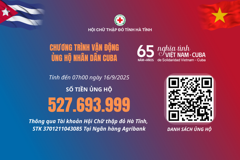 Thực hiện chủ trương của Trung ương Hội Chữ thập đỏ Việt Nam về việc tổ chức Chương trình ủng hộ nhân dân Cuba “65 năm nghĩa tình Việt Nam – Cuba”, thời gian qua, Hội Chữ thập đỏ tỉnh Hà Tĩnh đã phát động và kêu gọi sự tham gia hưởng ứng của các cấp Hội, cán bộ, hội viên, tình nguyện viên, thanh thiếu niên Chữ thập đỏ, các cơ quan, đơn vị, doanh nghiệp và đông đảo nhân dân trong tỉnh.