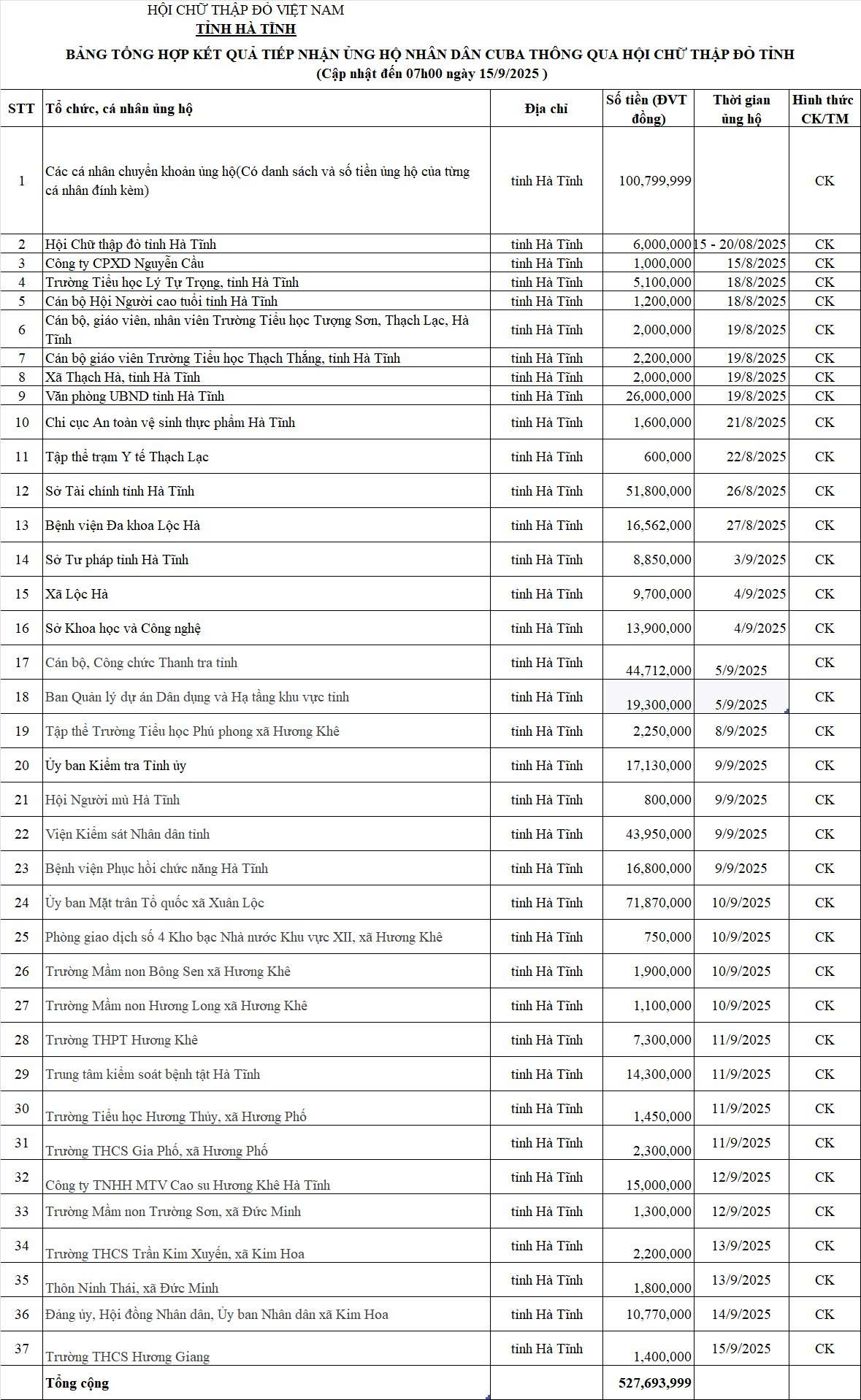 Đến 7h00 ngày 16/9/2025, Chương trình đã tiếp nhận 886 lượt ủng hộ với tổng số tiền 527.693.999 đồng. Toàn bộ số tiền này được chuyển qua tài khoản của Hội Chữ thập đỏ tỉnh Hà Tĩnh (số tài khoản: 3701211043085, Ngân hàng Nông nghiệp và Phát triển Nông thôn Việt Nam – Chi nhánh Hà Tĩnh II). Danh sách các tập thể, cá nhân ủng hộ được Hội thường xuyên cập nhật minh bạch, công khai qua mã QR hoặc đường link kèm theo.