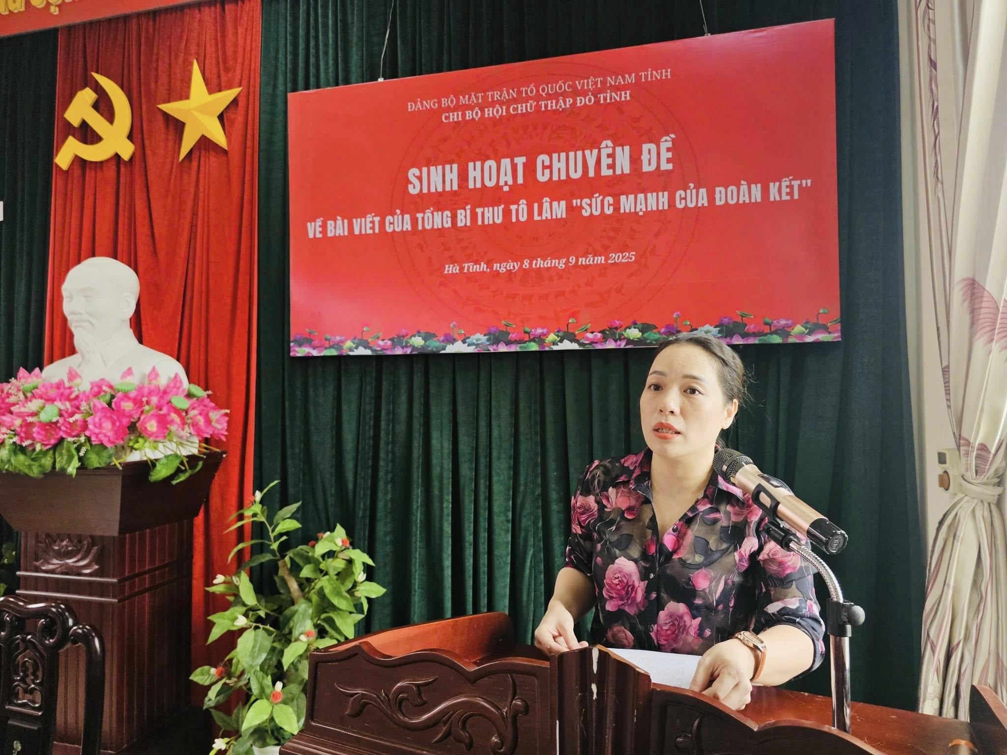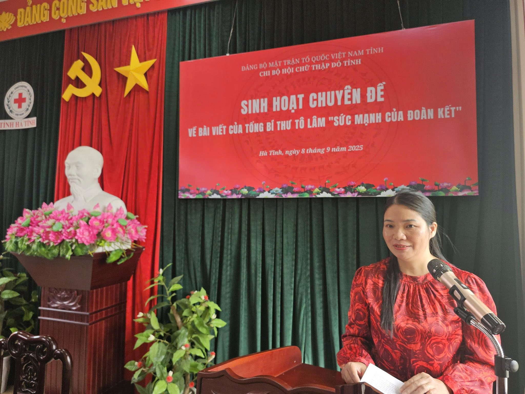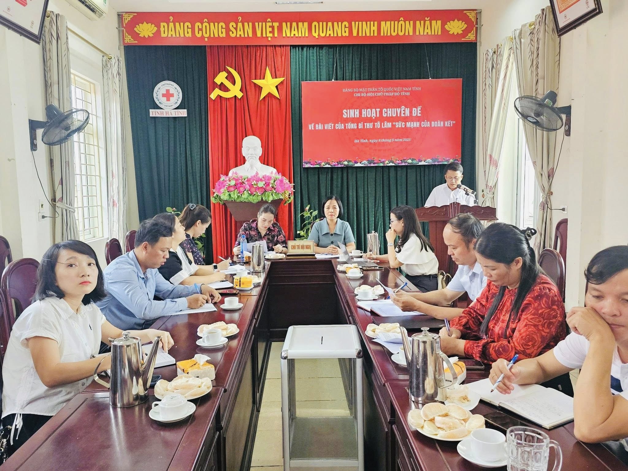 Kết luận buổi sinh hoạt, đồng chí Lê Thị Mai Hoa – Bí thư Chi bộ nhấn mạnh: đoàn kết là “sợi chỉ đỏ” xuyên suốt, là sức mạnh vô địch để hoàn thành mọi nhiệm vụ. Đồng chí đề nghị toàn thể cán bộ, đảng viên tiếp tục quán triệt sâu sắc tư tưởng chỉ đạo của Tổng Bí thư, nêu cao tinh thần trách nhiệm, gắn đoàn kết với kỷ luật, kỷ cương và nêu gương; đồng thời phát huy vai trò hạt nhân trong xây dựng khối đại đoàn kết toàn dân tộc, triển khai hiệu quả các phong trào nhân đạo, nâng cao chất lượng hoạt động Hội,tích cực tham gia xây dựng Đảng, góp phần xây dựng Chi bộ ngày càng trong sạch, vững mạnh.
