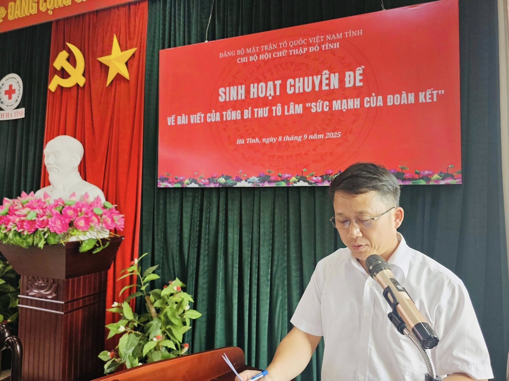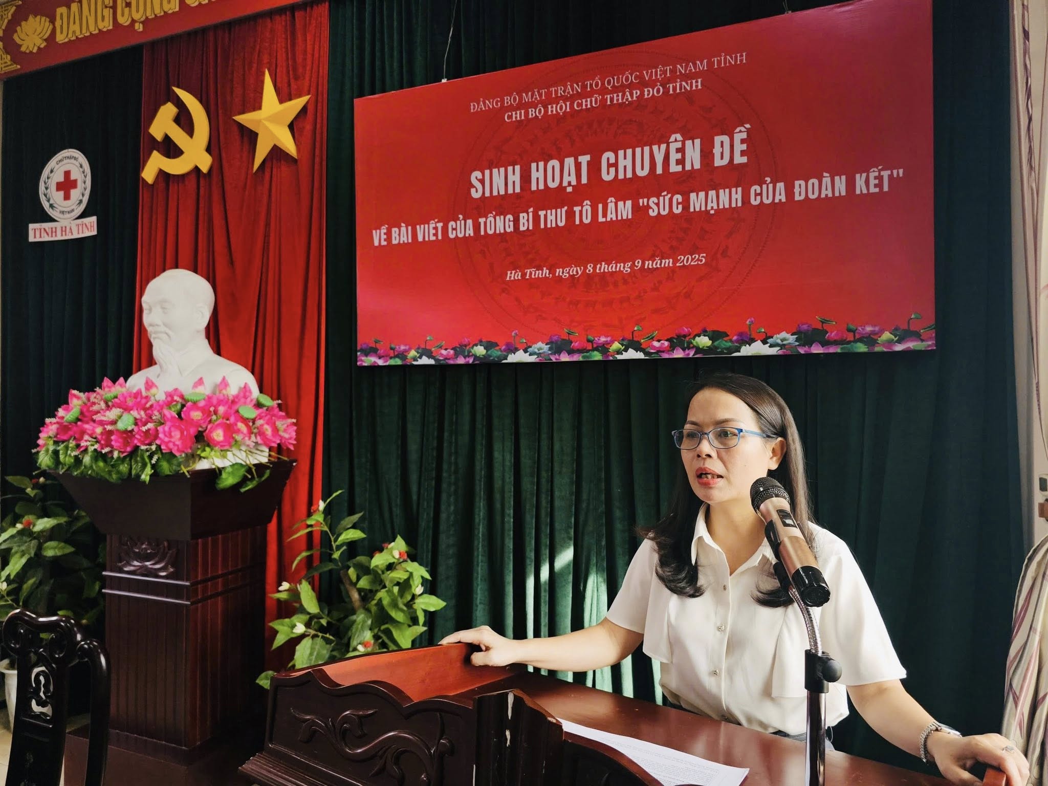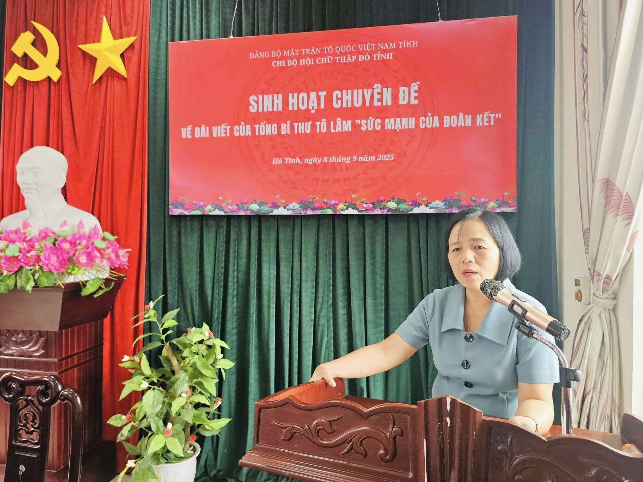 Kết luận buổi sinh hoạt, đồng chí Lê Thị Mai Hoa – Bí thư Chi bộ nhấn mạnh: đoàn kết là “sợi chỉ đỏ” xuyên suốt, là sức mạnh vô địch để hoàn thành mọi nhiệm vụ. Đồng chí đề nghị toàn thể cán bộ, đảng viên tiếp tục quán triệt sâu sắc tư tưởng chỉ đạo của Tổng Bí thư, nêu cao tinh thần trách nhiệm, gắn đoàn kết với kỷ luật, kỷ cương và nêu gương; đồng thời phát huy vai trò hạt nhân trong xây dựng khối đại đoàn kết toàn dân tộc, triển khai hiệu quả các phong trào nhân đạo, nâng cao chất lượng hoạt động Hội,tích cực tham gia xây dựng Đảng, góp phần xây dựng Chi bộ ngày càng trong sạch, vững mạnh.