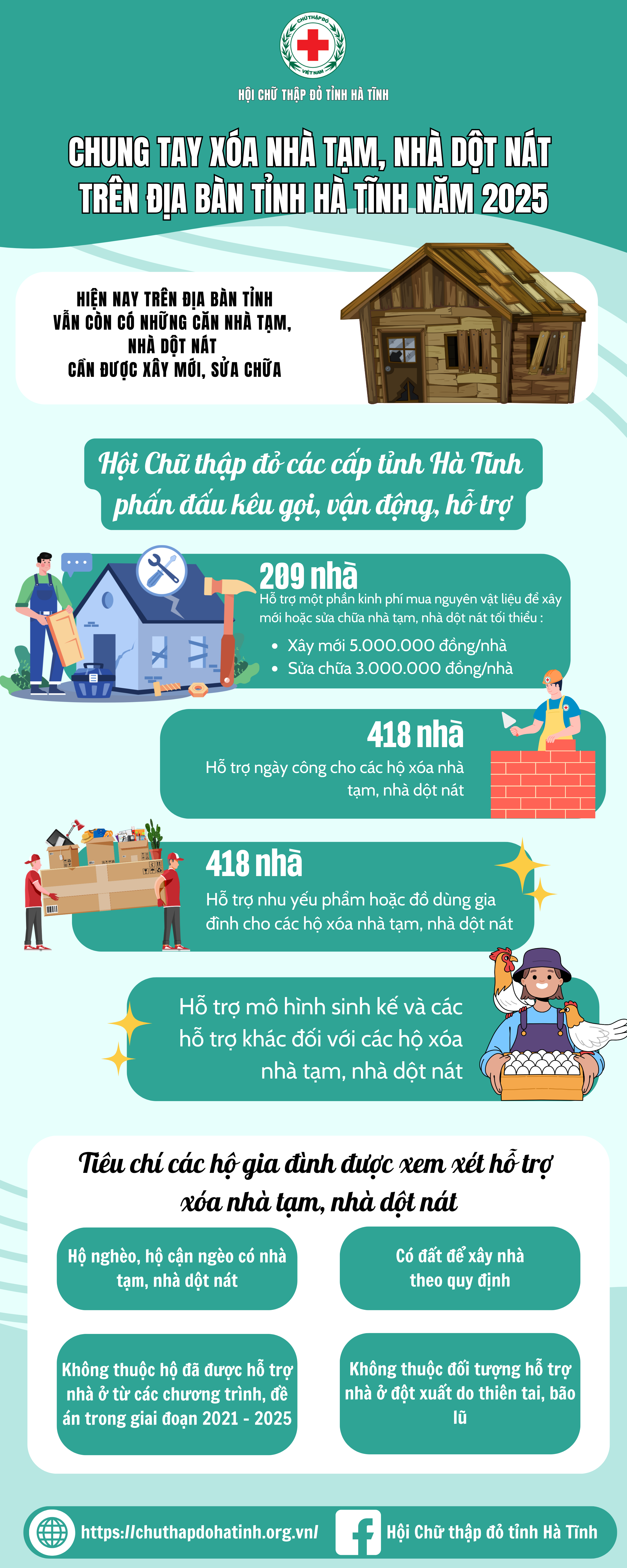- Huy động lực lượng cán bộ, hội viên, tình nguyện viên Chữ thập đỏ tham gia đóng góp ngày công hỗ trợ tối thiểu 418 hộ tháo gỡ, xây dựng, sửa chữa, xóa nhà tạm, nhà dột nát đảm bảo thực chất, hiệu quả;