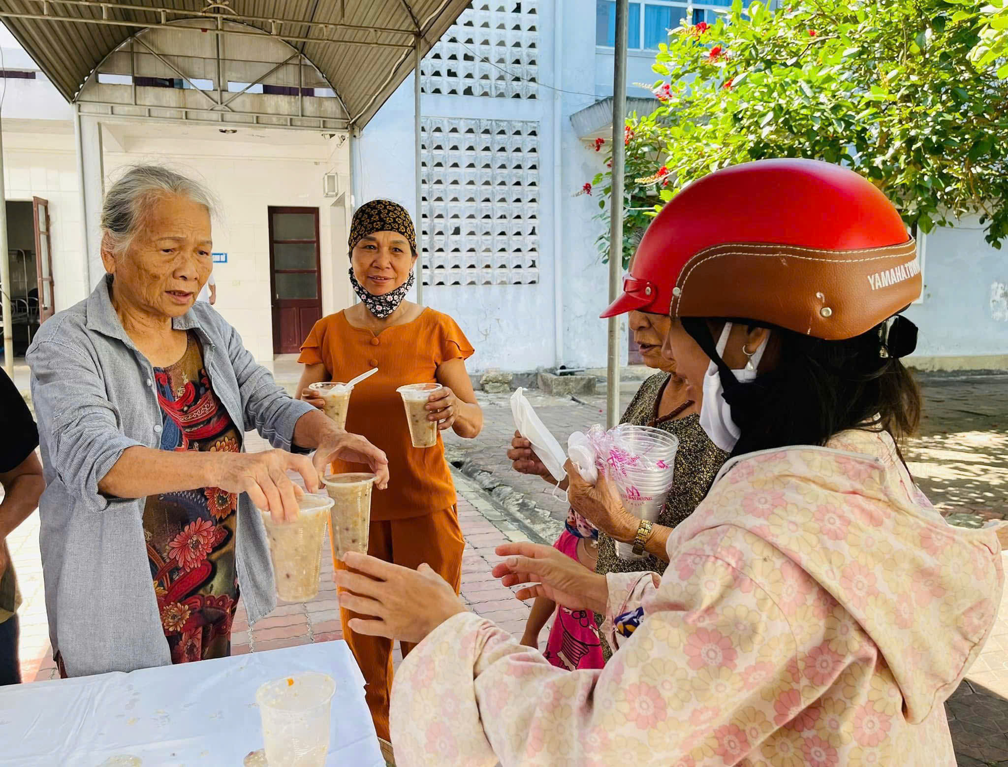 Bà Lương (ngoài cùng bên trái) trao cháo hỗ trợ bệnh nhân