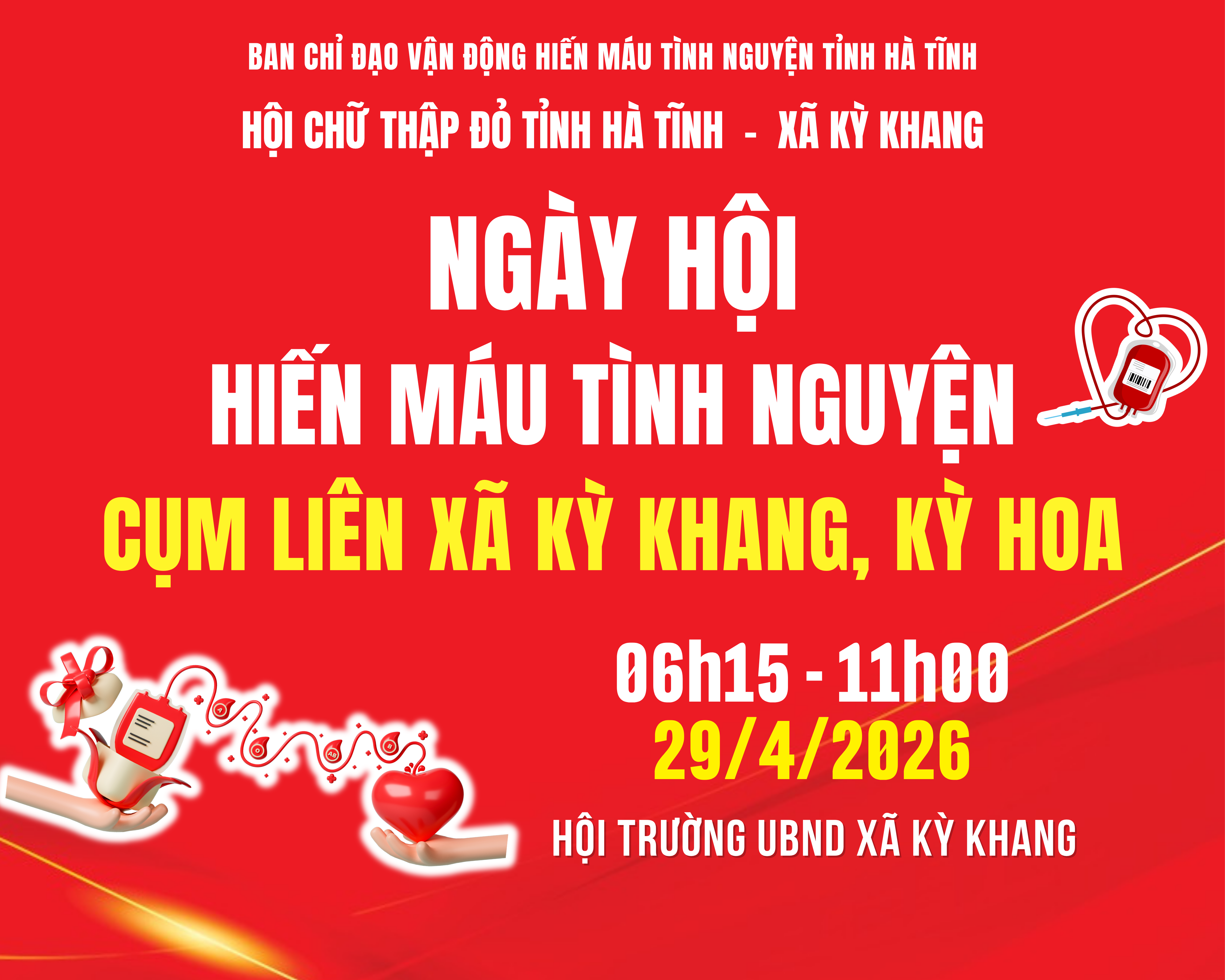 Hội Chữ thập đỏ tỉnh Hà Tĩnh trân trọng kêu gọi cán bộ, đoàn viên, hội viên và Nhân dân trên địa bàn các xã Kỳ Khang, Kỳ Hoa và khu vực lân cận tích cực đăng ký, tham gia hiến máu tình nguyện; đồng thời chung tay tuyên truyền, vận động người thân, bạn bè cùng hưởng ứng.