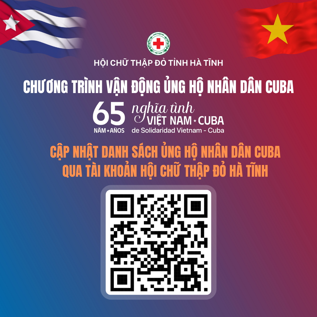 Hội Chữ thập đỏ tỉnh Hà Tĩnh đã nhận được nhiều sự quan tâm, chia sẻ từ các cơ quan, đơn vị, tổ chức, doanh nghiệp và cá nhân. Nhiều tấm lòng hảo tâm đã chuyển tiền ủng hộ qua tài khoản của Hội Chữ thập đỏ Hà Tĩnh (STK:3701211043085, tại Ngân hàng Nông nghiệp và PTNT-Chi nhánh Hà Tĩnh II) thể hiện tình cảm thủy chung, son sắt của nhân dân Hà Tĩnh dành cho nhân dân Cuba anh em. Hội Chữ thập đỏ tỉnh Hà Tĩnh trân trọng cảm ơn những nghĩa cử cao đẹp ấy và sẽ cập nhật công khai danh sách chi tiết các tổ chức, cá nhân ủng hộ tại mã QR và đường link dưới đây để mọi người tiện theo dõi: