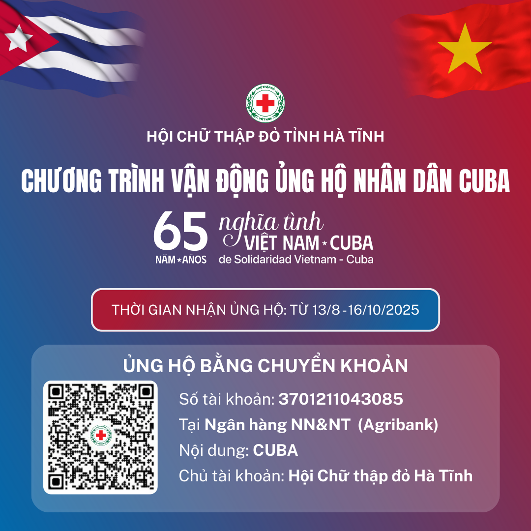 Mỗi đóng góp, dù nhỏ bé, đều là một nghĩa cử cao đẹp, gửi gắm tình cảm sâu nặng và tiếp thêm sức mạnh cho Nhân dân Cuba- người bạn thủy chung, son sắt của Nhân dân Việt Nam. Mỗi sự sẻ chia là một nhịp cầu nối liền hai dân tộc, lan tỏa thông điệp: “Việt Nam luôn bên cạnh Cuba – như Cuba luôn bên cạnh Việt Nam. Hội Chữ thập đỏ tỉnh Hà Tĩnh xin trân trọng ghi nhận và cảm ơn các cơ quan, đơn vị, tổ chức, cá nhân ủng hộ nhân dân Cuba.