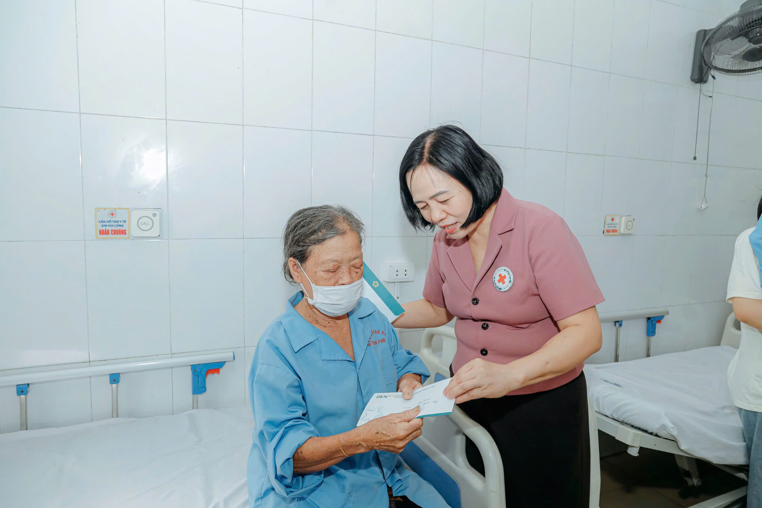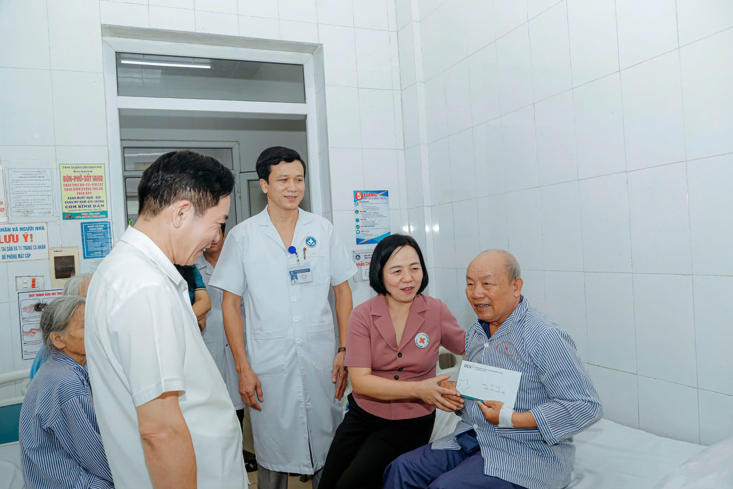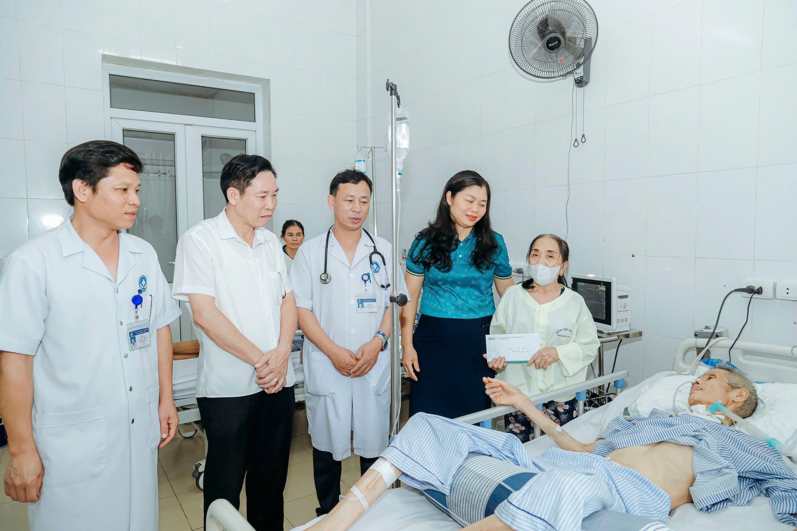 Bà Lê Thị Mai Hoa - Chủ tịch Hội Chữ thập đỏ tỉnh đại diện trao quà của Ngân hàng BIDV Hà Tĩnh cho bệnh nhân hoàn cảnh khó khăn