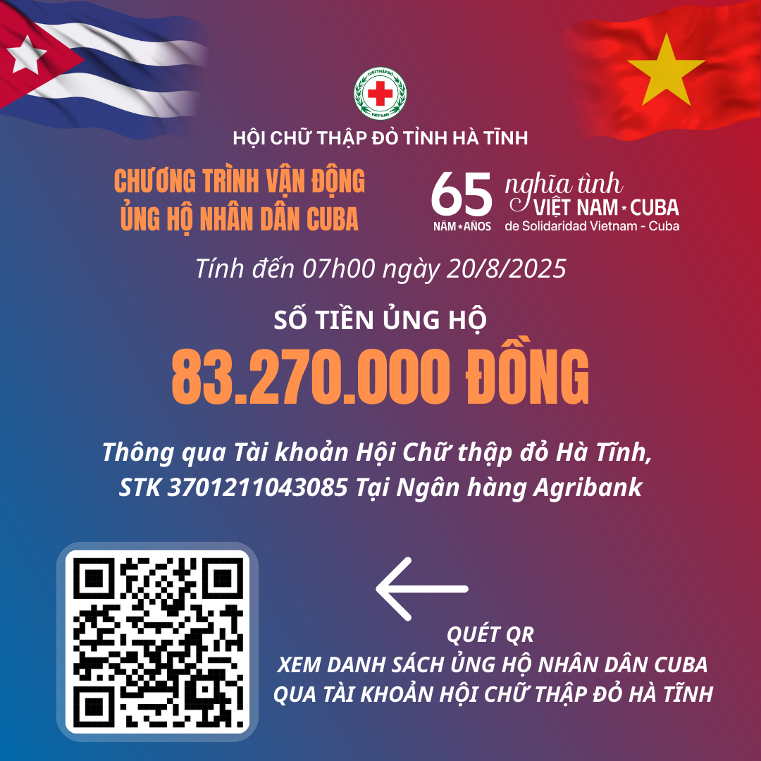 Hội Chữ thập đỏ tỉnh Hà Tĩnh trân trọng cảm ơn tình cảm sẻ chia, nghĩa tình sâu nặng của các cơ quan, đơn vị, doanh nghiệp và các nhà hảo tâm đã đồng hành cùng chương trình. Mỗi đóng góp của quý vị là một nhịp cầu nối tình đoàn kết, góp phần lan tỏa thông điệp nhân văn, cùng nhân dân Cuba vượt qua khó khăn, thắt chặt thêm tình hữu nghị Việt Nam – Cuba.