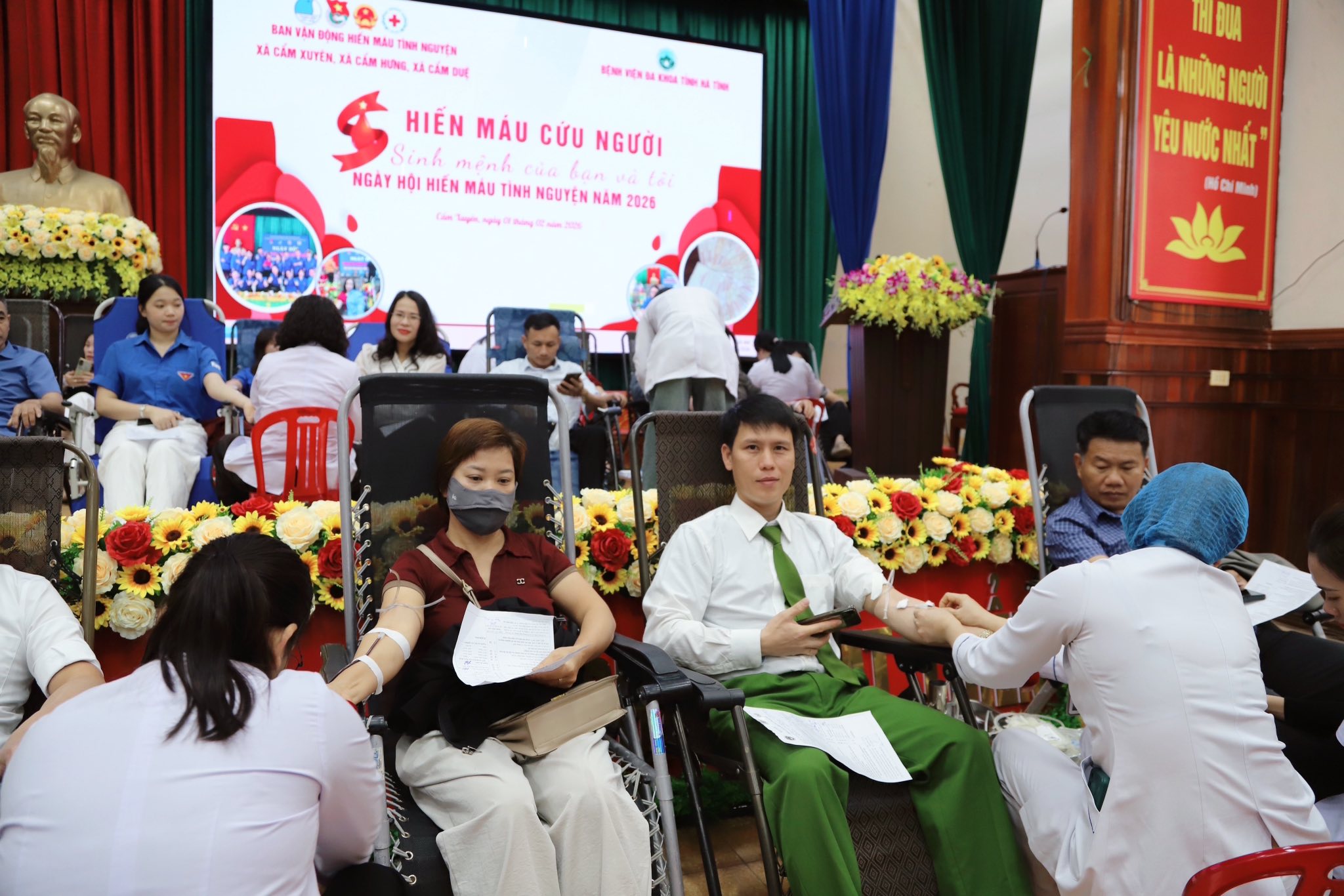 Tham dự chương trình có Thạc sỹ Hoàng Quốc Anh – Trưởng khoa Huyết học Truyền máu, cùng đội ngũ y, bác sỹ Bệnh viện Đa khoa tỉnh Hà Tĩnh; đại diện Ban Vận động hiến máu tình nguyện các xã Cẩm Xuyên, Cẩm Hưng, Cẩm Duệ; lãnh đạo Đảng ủy, HĐND, UBND các xã; đại diện các phòng, ngành chuyên môn và đông đảo tình nguyện viên tham gia hiến máu.