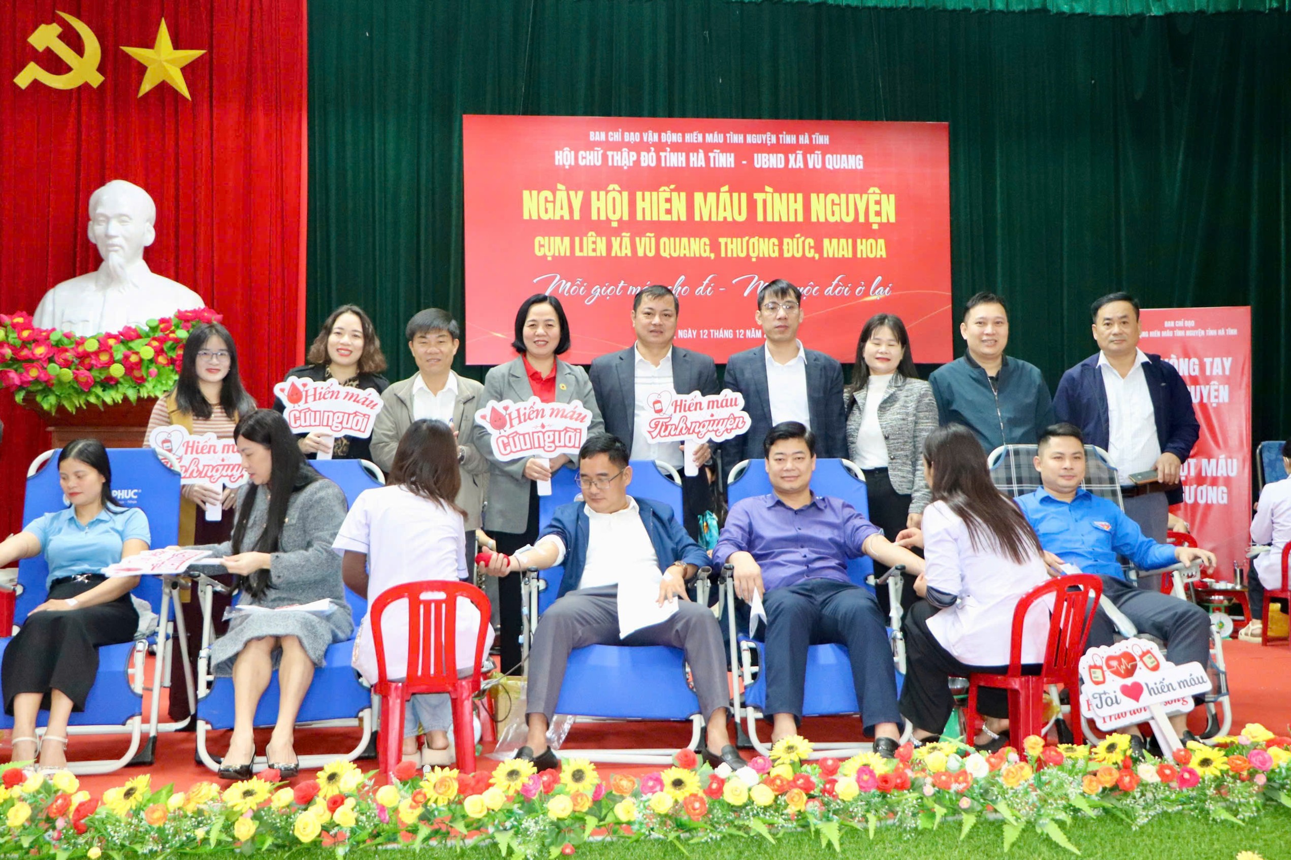 Về phía các địa phương trong cụm có đồng chí Phan Hồng Yến – Phó Bí thư Đảng ủy, Chủ tịch UBND xã Vũ Quang; đồng chí Trần Văn Trà – Ủy viên Ban Thường vụ, Phó Chủ tịch UBND xã, Trưởng Ban Chỉ đạo vận động hiến máu tình nguyện xã Vũ Quang; đồng chí Trương Thanh Hà – Ủy viên Ban Thường vụ, Phó Chủ tịch UBND xã Thượng Đức; đồng chí Nguyễn Anh Tuấn – Ủy viên Ban Thường vụ, Phó Chủ tịch UBND xã Mai Hoa; cùng đại diện các phòng, ban, ngành, đoàn thể của ba xã. Đội ngũ y bác sĩ Bệnh viện Đa khoa tỉnh Hà Tĩnh trực tiếp thực hiện công tác tiếp nhận máu.