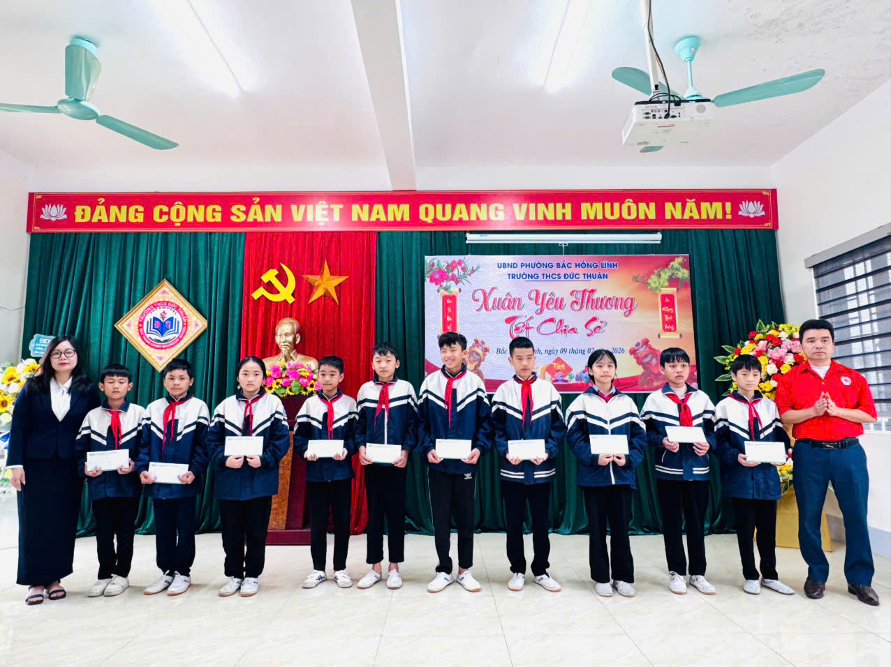 Sáng ngày 09/02/2026, Hội Chữ thập đỏ – Bảo trợ xã hội phường Bắc Hồng Lĩnh tiếp tục kết nối với Ngân hàng BIDV Chi nhánh Hồng Lĩnh, Hợp tác xã Tín dụng Đức Thuận và Chi hội Chữ thập đỏ – BTXH Trường THCS Đức Thuận, tổ chức trao 47 suất quà, tổng trị giá 25.500.000 đồng cho các em học sinh nghèo, cận nghèo, mồ côi, học sinh khuyết tật và học sinh có hoàn cảnh đặc biệt khó khăn nhân dịp Tết cổ truyền dân tộc.